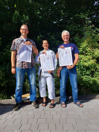 Unsere Dan-Träger Micha, Andrea und Florian (von rechts) haben sich einer Prüfung zum nächsthöherem Dan gestellt.